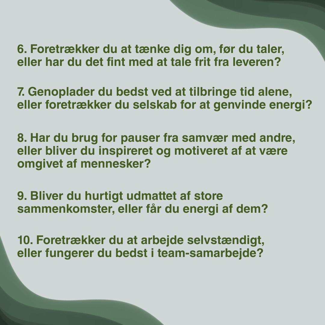 Hvis du derimod genkender dig selv mest i de sidste spørgsmål, hælder du måske mere til at være ekstrovert.