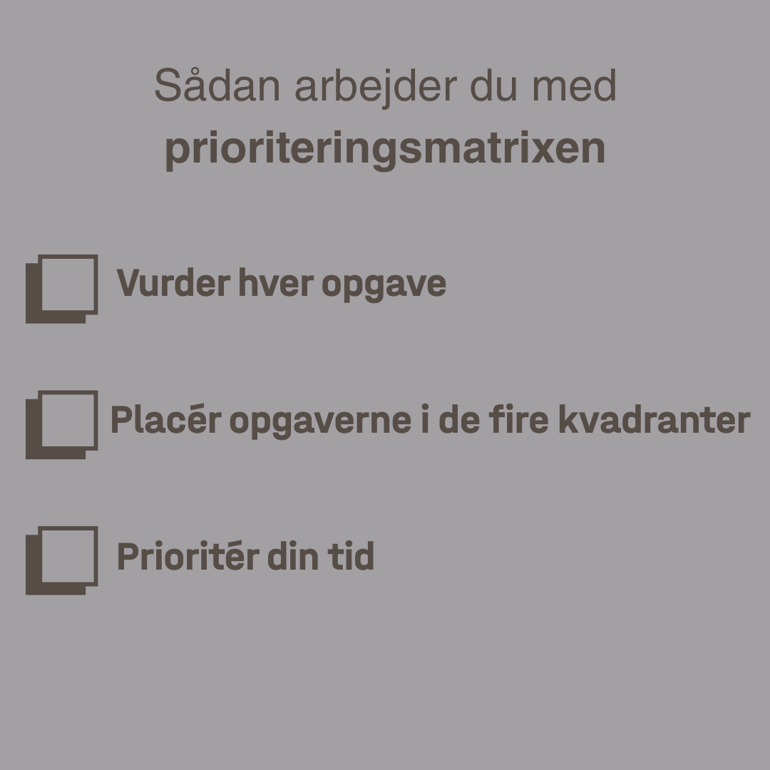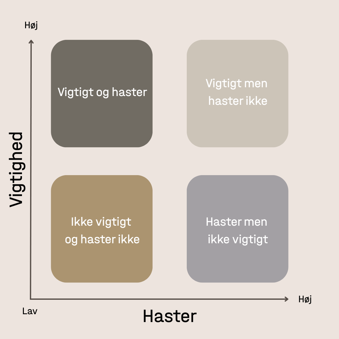 Det er et meget visuelt redskab, der kan hjælpe dig med at tilrettelægge din tid. Den er opdelt i fire kvadranter, der hjælper dig med at få overblik over, hvordan du bedst kan bruge din tid og energi.