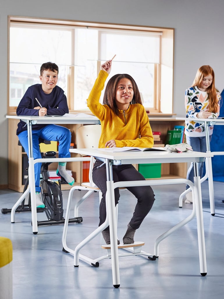 - Hæve sænke skoleborde: Borde, der kan justeres i højden, giver eleverne en nem måde at variere deres arbejdsstilling i løbet af dagen. Læs mere om elevborde i vores guide!